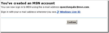 Về sau, nếu muốn đăng nhập vào trở lại, bạn nhớ gõ vào đầy đủ địa chỉ email như đã đăng ký, có cả phần đuôi @msn.com.